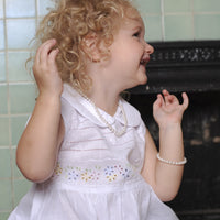 We recommend small cultured white pearls in a 14 inch necklace suitable for infants, children, young teens and some petite women. Our small pearls are 5mm in diameter.