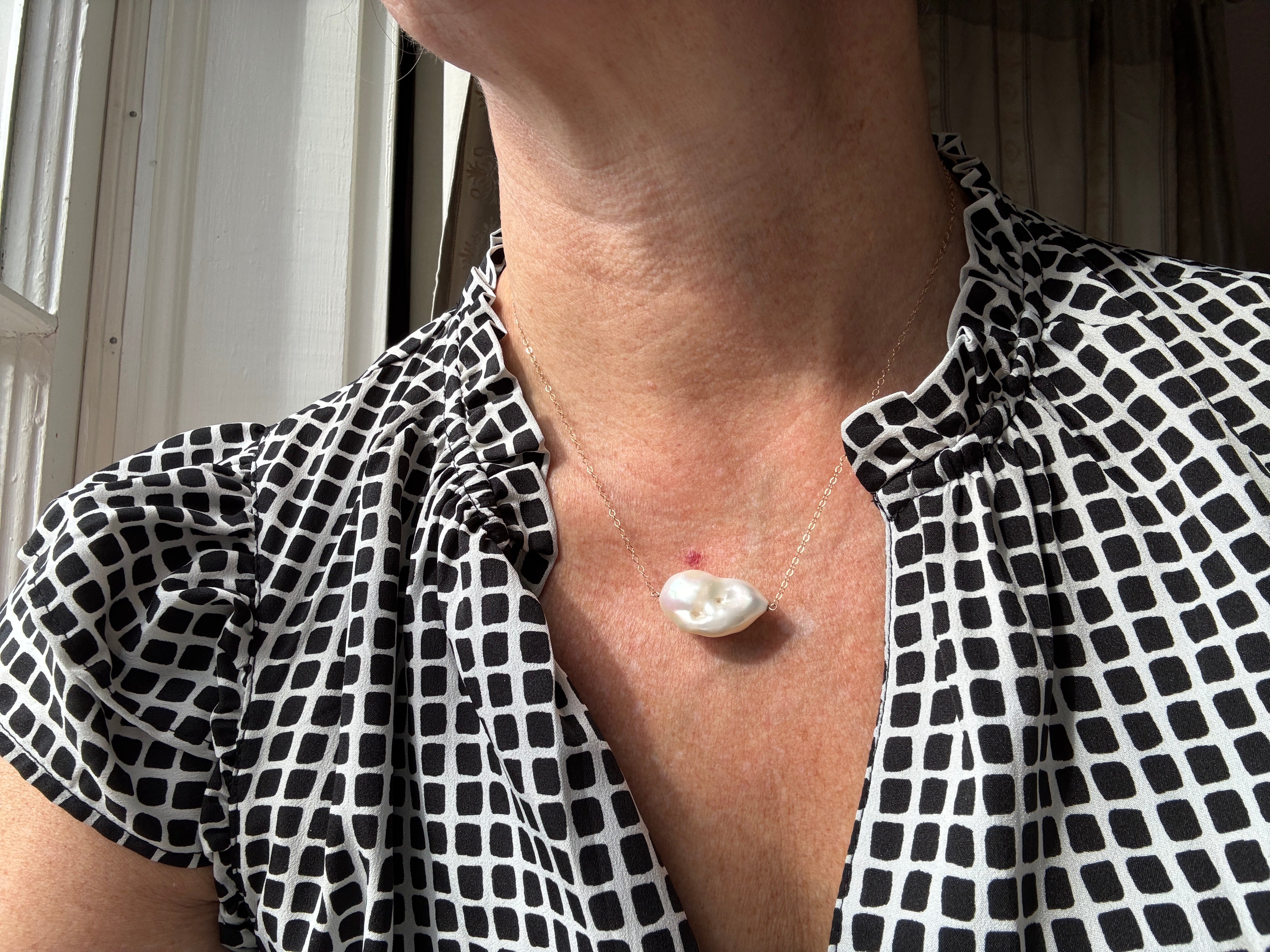 The beauty of this piece lies in its simplicity. The large, unique pearl is set on a delicate 14K gold fill chain, creating a timeless look that works with any style.