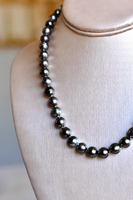 This is another example of a small and black Tahitian pearl necklace. These pearls range from 11mm (the smaller size in the other necklaces), down to 8mm. And, as y'all know from my videos, 8mm is not a very typical size in Tahitian pearls. So, this is a unique strand and perfect for the of you who prefer the color of Tahitians but also prefer to go smaller.