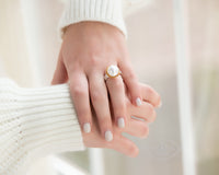 Our Pearl Ring is made of sterling silver or 14K gold fill. The delicate cup holding the pearl is made of 14K gold fill. And we use a gorgeous large pearl (12mm). Our pearls are genuine cultured pearls... a real pearl for your real pearl ring!