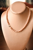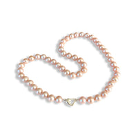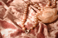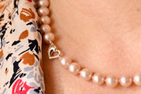 Oo-lala! This is our classic freshwater cultured pearl necklace in pink. Hand knotted by our makers in the Athens, GA, this timeless necklace is available with a sterling heart clasp for a limited time!
