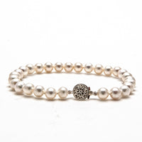 This bracelet features 7mm (medium) cultured pearls. Features a sterling silver filigree clasp. Want to upgrade to 14K? Let us know and we can work with you on a custom order!