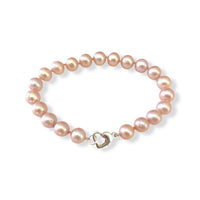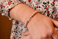 This is our classic freshwater cultured pearl bracelet in pink. Hand knotted by our makers in the Athens, GA, this timeless bracelet is available with a sterling heart clasp for a limited time!