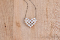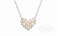 It is always easy to say "I Love You," with the gift of cultured pearls but with this gorgeous necklace, the conversation just got a whole lot easier. This gorgeous necklace features 4-5mm pearls. These are The Pearl Girls small pearls, woven into a heart shaped design. We have attached it to a beautiful sterling silver chain. Choose from white or pink pearls.