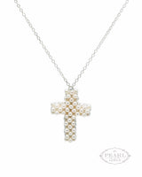 A hand woven cultured pearl cross. Wear as a beautiful pearl enhancer to add to any of our pearl necklaces or order it on a beautiful sterling silver chain. Created with luxurious small cultured (3mm) pearls. This pearl cross is a gorgeous expression of your faith.