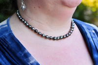 This is another example of a small and black Tahitian pearl necklace. These pearls range from 11mm (the smaller size in the other necklaces), down to 8mm. And, as y'all know from my videos, 8mm is not a very typical size in Tahitian pearls. So, this is a unique strand and perfect for the of you who prefer the color of Tahitians but also prefer to go smaller.